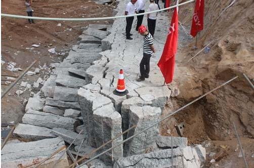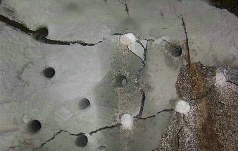 (4)高效无声破碎剂充填:填孔之前必须将孔清理干净,不得有水和杂物。充填作业可以采用直接灌入或用灰浆压入孔内。灌孔必须密实,不必堵塞孔口。水平或倾斜要用于稠的胶泥状HSCA搓成条塞入孔中并捣实。搅拌后的HSCA浆体必须在10分钟内充填在孔内,否则,流动性及破碎效果降低。灌浆时到裂纹发生前,施工员必须戴防护眼镜并不得对孔直视,以防万一发生喷浆伤害眼晴,碰到皮肤或眼睛要立即用水冲洗,到院就医。