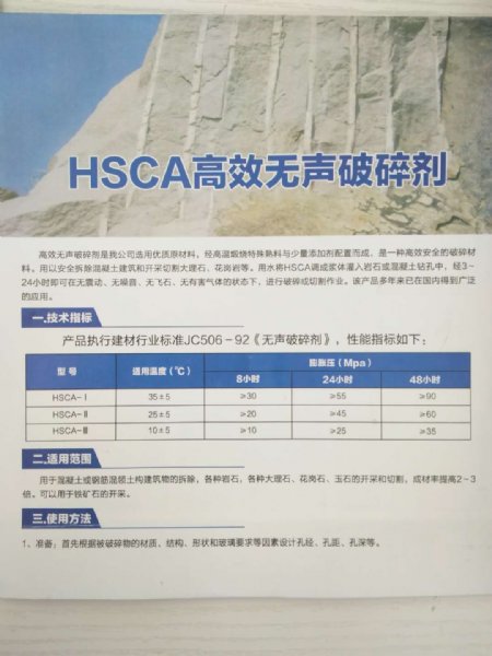 高效无声破碎剂(也称无声碎石剂、破石剂、裂石剂、静态碎石剂)是一种粉状高效能安全 破碎材料,用以安全拆除混凝土建筑和开采切割大理石、花岗岩。用水将HSCA调成浆体灌入岩石或混凝土钻孔中,经3~8小时即可在无振动、无燥声、无飞石、无有害气体的情况 下,进行破碎或切割作业。该产品多年来已得到广泛的应用并销往国外。