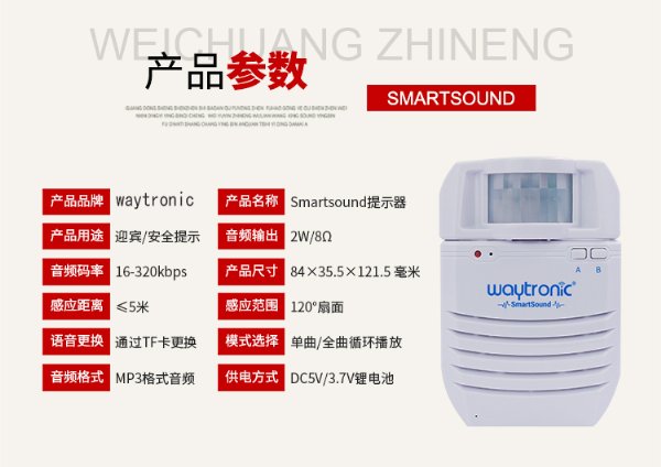 红外人体感应语音提示器,人体感应是一种利用红外热释电原理感应人体活动信息的技术,当人进入感应范围内时,就能准确的识别、检测和被动式感应人体活动的信息,语音报警器在探测到人体经过时,能在*一时间发出温馨提示、警报、问候语等语音,也可以根据不同的应用场合,随时更换不同的语音,达到不同需求的播放效果。