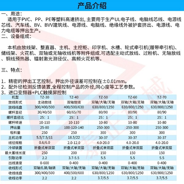 电子线押出机及35mm电源线押出机由放线架、整直器、主机、主控柜、印字机、水槽、轮式牵引机(履带牵引机)、储线架、火花机、双轴或无轴收线机等附件组成.可选配主动式放线、过粉机、无轴放线、铜线预热器、镭射激光测径仪、高频火花机等。