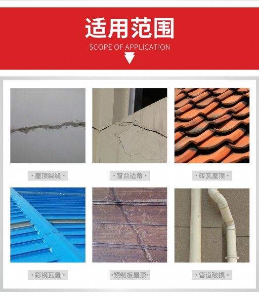 4、车厢等渗漏部位的修补 抗化学腐蚀性,搞紫外线能力强,耐高温 耐低温 使用寿命20年以上终生不固化,承受一定程度位移 使用方便,用量准确。