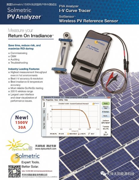 1500V美国 SOLMETRIC PVA1000S, PVA1500户外IV测试仪高测量强度意味着它可以测量1兆瓦在2小时内,甚至在高温环境中的其他曲线示踪器关闭的情况下。坚固的外壳可防水防尘。入射角修正传感器能够在低光照条件进行精确地辐射读数,以此扩展你的工作视野。