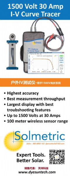 30A测量能力包。1500V美国 SOLMETRIC PVA1000S, PVA15000户外IV测试仪测量电流限制标准从20A扩展可达30A。这对平行测量许多字符串是有用的,例如当采用汇流箱前治理时。
