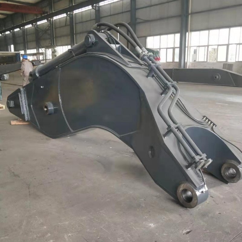 挖掘机岩石臂也称为称鹰嘴臂、超级勾,是专业为风化岩和页岩进行加工设计的,在一般情况下,标准臂的松土器无法进行工作,破碎锤的工作效率又相对于松土器的工作低下,无法满足工程需要和创造更大的利润。挖掘机岩石臂的工作,因为整体的臂进行缩短和内部填充加重,像45吨左右的机型大小臂可达16-17吨,能够很大程度上面增加了挖掘机的挖掘力度,能够克服更加恶劣的工作环境。