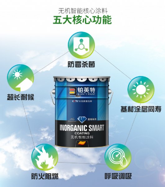 铂英特无机智能涂料以碱金属硅酸盐及硅溶胶为主要黏结剂,材料采用欧洲标准A级环保材料,品质严格按照国家儿童涂料产品标准GB/T34676执行。经专业团队研发配方制造而成,不含甲醛,挥发性有机物,重全属等有害物质,适用于机场、火车站、博物馆、办公室、居室等重要场所内外墙的装饰和保护。