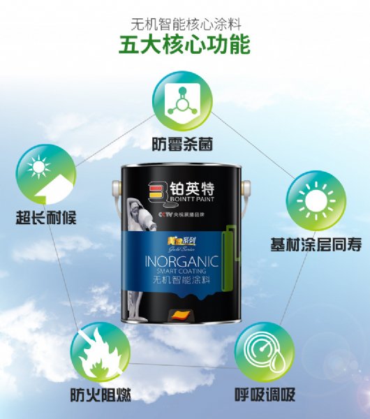 铂英特无机智能涂料以碱金属硅酸盐及硅溶胶为主要黏结剂,材料采用欧洲标准A级环保材料,品质严格按照国家儿童涂料产品标准GB/T34676执行。经专业团队研发配方制造而成,不含甲醛,挥发性有机物,重全属等有害物质,适用于机场、火车站、博物馆、办公室、居室等重要场所内外墙的装饰和保护。