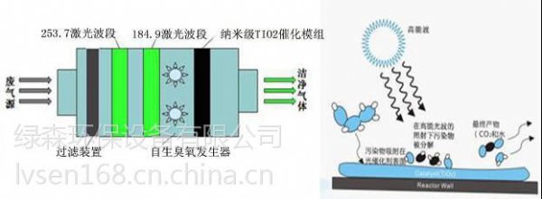 三、恶臭气体利用排风设备输入到本净化设备后,净化设备运用高能uv紫外线光束及臭氧对恶臭气体进行协同分解氧化反应,使恶臭气体物质其降解转化成低分子化合物、水和二氧化碳,再通过排风管道排出室外。