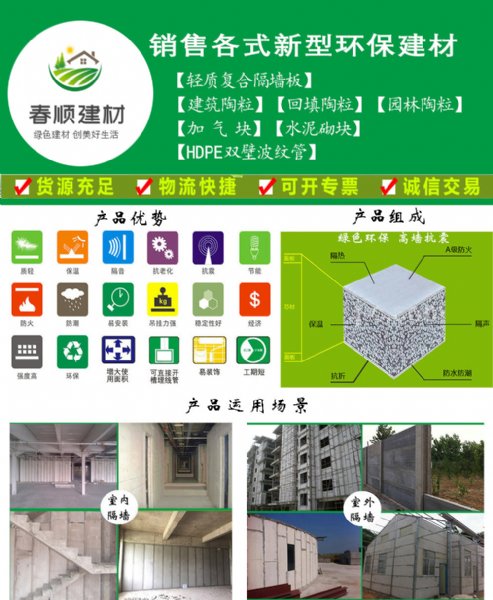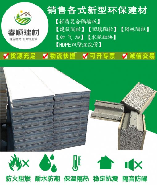 主营业务:轻质复合隔墙板,复合隔墙板,陶粒隔墙板,陶粒颗粒,建筑陶粒,回填陶粒,加气块,水泥砌砖,双壁波纹管