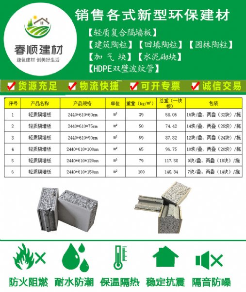 江西春顺建材装饰有限公司生产的轻质隔墙板规格齐全,常见厚度分别为60、75、90、100、120、150mm,长度为2.44米、宽度0.61米。各种规格轻质隔墙板检测报告齐全,资质完善,朋友们可以放心选购。