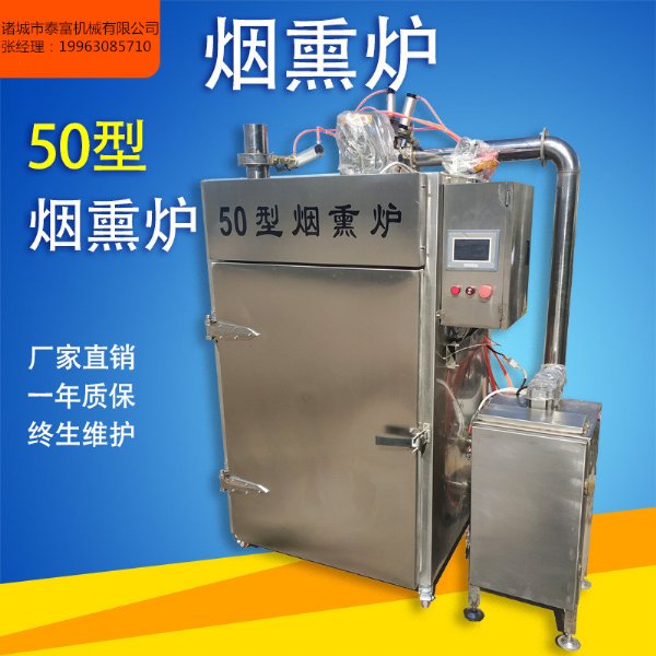 12.烟薰箱配置下进烟结构,并设有烟量可调风门;烟道管路短,污染少,拆洗方便。发烟器由SUS304优质不锈钢制造,适用于标准木粒发烟;配有发烟温度传感器及灭火喷头,防止木粒明火燃烧;能根据加工需求,控制烟雾浓度。