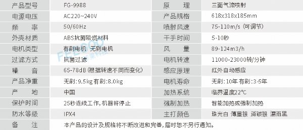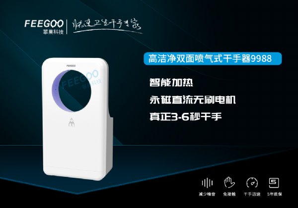FEEGOO(菲果)FG9988多面喷气式干手器是理想产品。高性能的无刷直流电机,一天使用1000次,其实际使用寿命可达10年以上;微电脑全自动控制,使得风速更高,性能更加稳定。独创的红外闪频技术,使得感应机可抗强光线干扰。采用新的四重过滤配置(纳米银,维他命,光触媒,去尘),使得空气净化率达到99%。