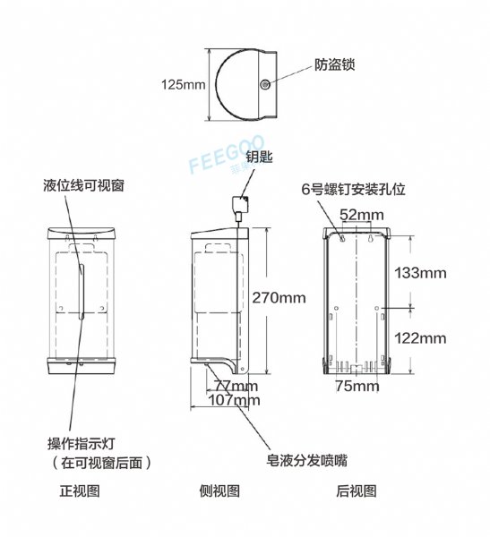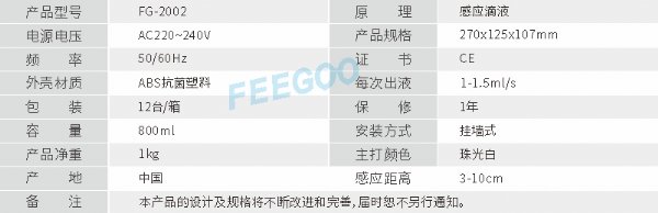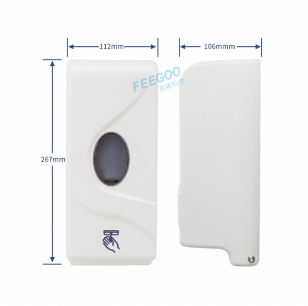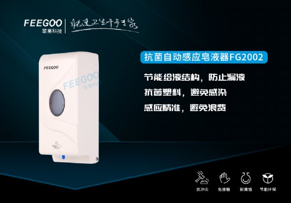 FG2002高强度ABS自动感应皂液器采用ABS抗菌工程塑料,在原始的按压式基础上改良为感应式皂液,免接触会避免交叉感染,三种款式:泡沫款、滴液款、喷雾款,设计了低电量提示:蓝灯闪烁。