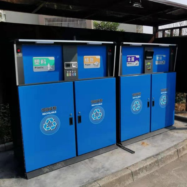 蓝色箱都是可回收的垃圾,灰色箱是易腐垃圾和其他垃圾。有害垃圾的投放箱是红色的,设在可回收垃圾和礼品兑换机的中间,也是做好了详细的分类。