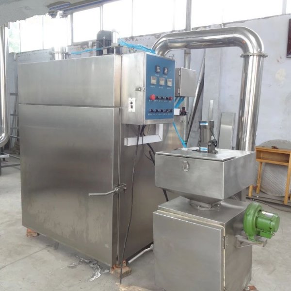 本设备由烟熏箱、自动程序控制器、烟雾发生器、烟熏车四部分组成。关键部件是由蒸汽管道、热交换器和出气通道组成完善的循环系统,箱内熏烟与热气的混合气体在两组循环风机的作用下,形成涡流区域,使混合气体以适宜的速度平衡而均匀地通过悬挂在烟熏箱内的肉制品,使其熟化和灭菌。