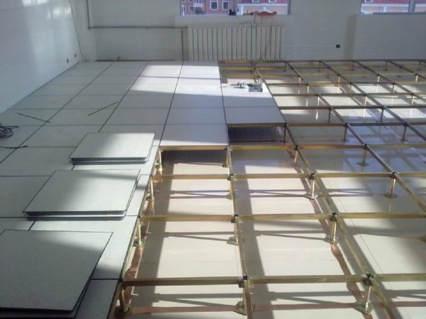 四边支承式结构,采用优质钢板经拉深成型、点焊、喷塑,内腔填充发泡水泥填料中,表面粘贴三聚氰胺防静电贴面或PVC贴面,防静电陶瓷贴面,四周镶嵌导电嵌条,支座、横梁整体镀锌,支座高度可调并能自锁.