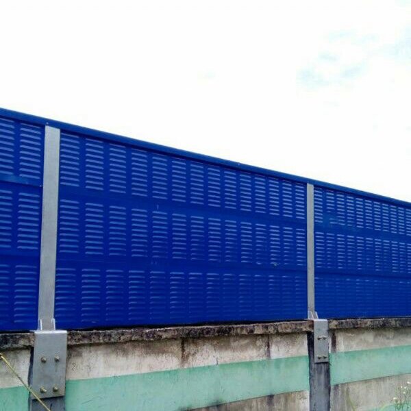 1. 金属隔声屏障:面板及孔板采用镀锌板制作,也可根据用户要求采用冷轧板、铝板或不锈钢板。根据不同的隔声需求,填充材料选用不同容重的超细玻璃棉板或岩棉板,外敷无碱憎水玻璃布。外表面可进行喷塑处理,有多种颜色可供选择。计权隔声量Rw=30~42dB(A),吸声系数NRC=0.95~0.98。