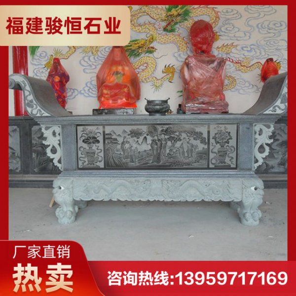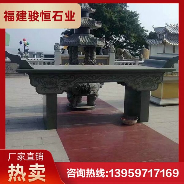 石雕供桌用来放置香烛贡品牲礼之用,有分体式也有整体式,其设计构造大致可分为桌面、桌脚以及裙面。在寺庙文化里,供桌的大小,材质,以及摆放的位置都是有讲究的,及雕刻所选用的石材。其中,花岗岩和青石质地坚硬,是石雕供桌常用的两种雕刻石材。石雕供桌常见款式为长方形,面中间是一精致的供桌,雕刻一龙王看庙,高度约与方桌相等。祭祀时常供设 香炉、蜡竿和摆放供品,此为石头所制,故名石供桌。供桌常见几种地方摆放,厅堂供桌、佛堂供桌、寺庙供桌、神台供桌等, 与其配套的有香炉、石鼎。