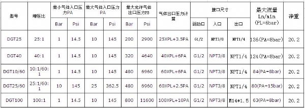 DGT系列气体增压器采用单气控非平衡气体分配阀来实现增压器的往复运动,全部采用铝合金及不锈钢制造,全部密封件均为进口优质产品,*大设计驱动气压为10bar,为了保证增压器的寿命,建议驱动气压≤8bar此系列的驱动活塞直径为160mm,为双作用增压器。