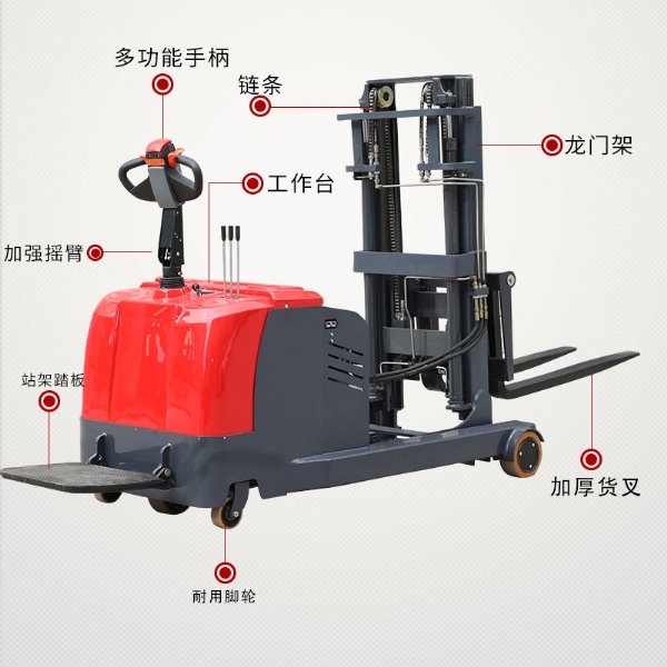 电动堆高车是以蓄电池电力作为能源,电机作为动力源的一种仓储设备。主要的结构包括:电瓶、电机、液压泵、油缸、活塞杆、货叉、链条、控制器等等装置。