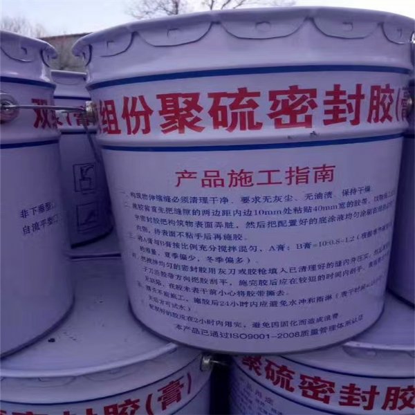双组份聚硫密封胶有两种包装,一种为纸箱包装,内含白料5桶、黑料1桶,每箱重25kg,每桶重约4.2kg。另一种为铁桶包装25公斤/ 桶。使用时要将黑料倒入白料内搅拌均匀,注入胶枪内,使用胶枪打入需要施工的部位。
