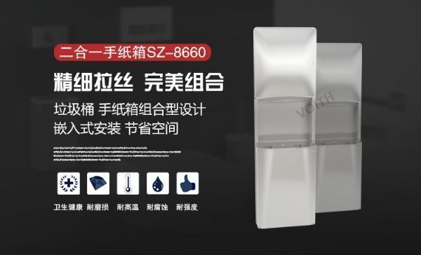 VOITH福伊特抽纸烘手垃圾桶一体机:高功率激光深穿透焊接技术,使304材料更紧密结合;不锈钢表面使用电化学抛光技术,使产品更细腻亮丽;表面纳米抗氧化处理,使产品长年使用也不会生锈。我们的产品每个细节都从实用性的角度出发,每个技术都源于以人为本的考虑,在节能环保的同时,让你的每次使用都成为一种舒适享受。图片上看到不的品质和工艺,您将在使用后发现