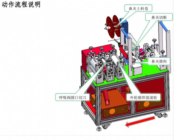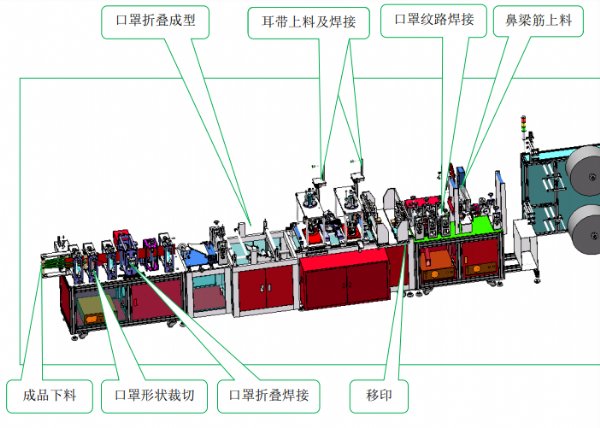 工艺流程: 整卷布料放卷后经过滚轮复合在一起,布料通过机械折叠、鼻梁条整卷牵引放卷,定长裁切后导入 至包边布料中,双边通过超声焊接至封口,再经过超声侧向封口,通过切刀裁切成型。 - 佛山市嘉迪昊智能设备有限公司