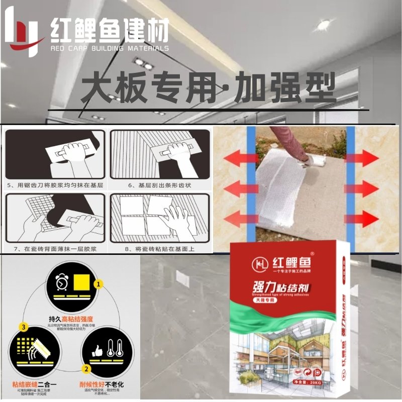 红鲤鱼强力粘结剂是一种聚合物改性的水泥基陶瓷砖*粘结剂,其施工操作性能、粘结性能等较之传统的水泥砂浆有大幅改善。无需浸砖,施工快捷;薄层施工、减轻自重;粘结力强、不易空鼓;*环保、耐侯、耐水性好。瓷砖胶泥适用于室内外混凝土、抹灰基面、砖墙面上粘贴普通瓷砖、陶瓷、马赛克和小型天然石材。