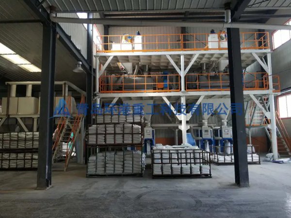 该生产线由储料系统、输送系统、称重配料系统、混合系统、成品储存系统、包装系统、除尘系统和电控操作系统等组合而成。在秉承传统干粉混合生产线运行稳定、计量精确、操控简易的基础上,采用顶部配料的方式,减少物料输送行程,降低批次生产所需时间,提高产量。物料在整个生产流程中都在密封环境下进行,降低灰尘。再配备我公司生产的高性能脉冲除尘器,大大改良生产环境,保证工作人员的身体健康。