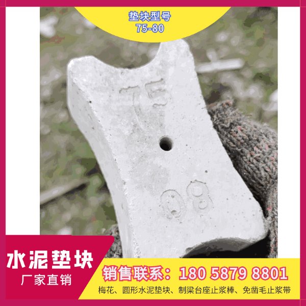 主营业务:标准垫块、C50垫块、支撑垫块、圆饼垫块、梅花垫块、高强度混凝土垫块、预制梁免凿毛带、制梁台座止浆棒