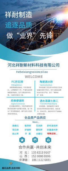 河北祥耐新材料科技有限公司(雄安直供中心),拥有28年行业运营资历,年生产量超过210万平方米,中国未来“海绵城市”海绵城市助力者,河北雄安新区未来城市建设基础建材供应商,集产品研发、生产、销售、施工为一体,全能综合新型建材生产销售。主要产品广场透水砖、便道砖、植草砖、路沿石等百余种路面材料水泥制品,销售区域遍及华北地区及周边12个省市。近30年的砥砺前行,祥耐制造的综合实力已屹立于华北地区行业翘楚之位。欢迎各界人士莅临我厂参观指导,洽淡合作。