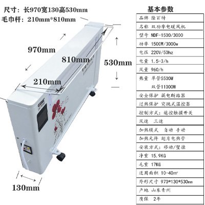 产品说明:智能电暖风机:不锈钢翅片加热管,智能触摸液晶显示器,配有多功能遥控器。耐高温铝合金风叶。节能省电,热效率高,瞬间高温快速制热寿命长使用安全等特点。1500瓦建议使用面积15平方,3000瓦建议使用面积30平方,买家可根据室内实际温度与房子的保温,密封,室外环境温度实际情况购买机器大小。