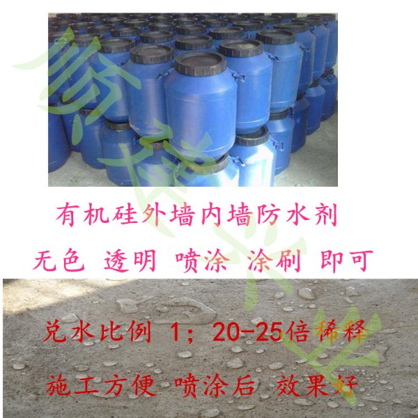 有机硅防水剂是一种防水材料,喷涂(或涂刷)于建筑物表面后,可在其表面形成一层无色透明、透气薄膜,当雨水吹打其上或遇潮湿空气时,水滴会自然流淌,阻止水分侵入,同时还可以将建筑物表面尘土冲刷干净,从而起到使内墙防潮、防霉、外墙洁净及防止风化等作用。