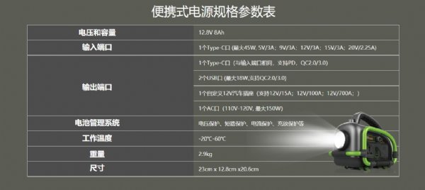 ● 多输出端:1个Type-C接口,2个USB接口,1个输出接口,1个交流插座和1个自定义的12V汽车接口。