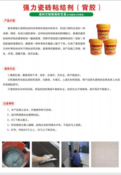 “星鸟”强力瓷砖粘结剂采用高科技纳米新技术,和进口原料合成的一种坚硬、刚性、粘结力强的液体。这种粘结剂有极强的抓捕能力,普通的瓷砖粘结剂所贴的瓷砖轻轻一敲就脱落,而新开发的强力瓷砖粘结剂(背胶)所贴的瓷砖坚硬如石,像壁虎一样牢牢粘在基面上敲不下来。杜绝了高密度砖石材料等粘结材料不易粘结而空鼓、脱离等质量隐患。该产品施工简便、绿色、环保。质量可靠,经济实惠。