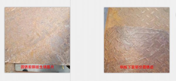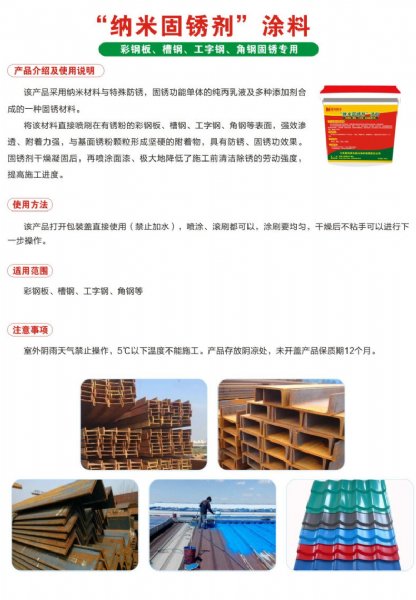 该产品采用纳米材料与特殊防锈,固锈功能单体的纯丙乳液及多种添加剂合成的一种固锈材料。将该材料直接喷刷在有锈粉的彩钢板、槽钢、工字钢、角钢等表面,强效渗透、附着力强,与基面锈粉颗粒形成坚硬的附着物,具有防锈、固锈功效果。固锈剂干燥凝固后,再喷涂面漆、极大地降低了施工前清洁除锈的劳动强度,提高施工进度。