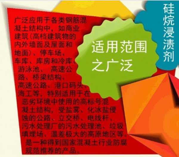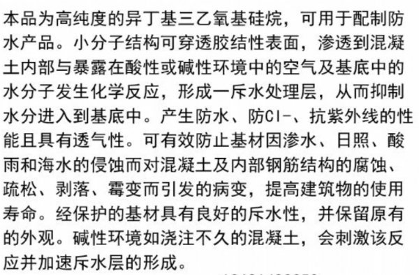 硅烷浸渍液:无色透明液体,涂装后不改变混凝土本色。可渗透入混凝土内部,形成防水、透气的防护层,耐久性能优良。对于海水、盐雾蚀、融雪剂、冻融对混凝土的侵蚀有优良的防护作用。防护期限可达10 ~25年。化学名称:异丁基(烯)三乙氧基硅烷液体