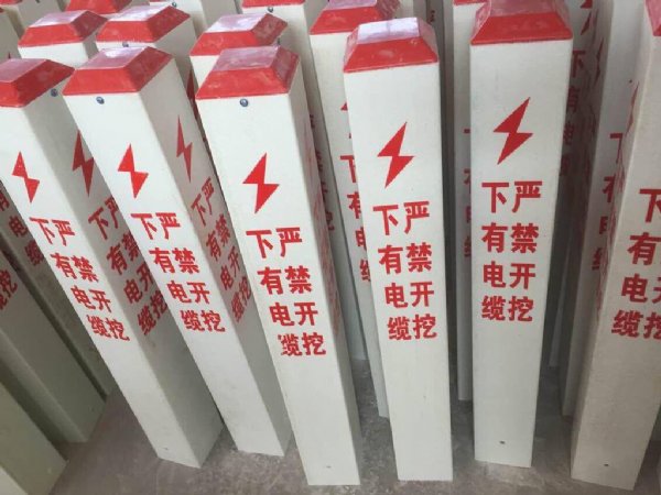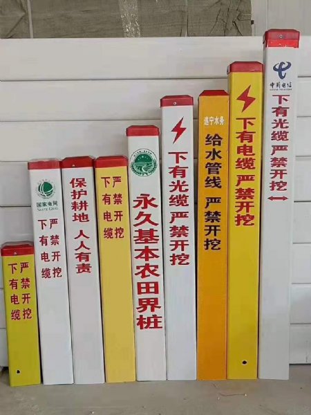 塑钢标志桩玻璃钢标志桩:经高温压制而成。抗冲击,耐磨损,耐高温,耐腐蚀,可以抗水、汽油、酒精、电解盐、醋酸、盐酸、钠钾化合物、尿、沥青,适合各种酸碱土壤。使用寿命长达30年。内容采用丝网印刷技术,效果好,不需要维护。重量轻,便于运输安装。无回收价值,自然防盗。