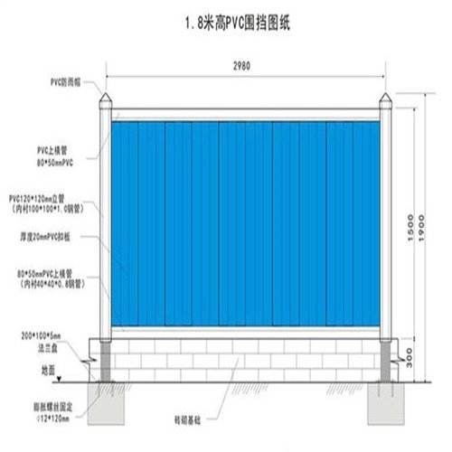 施工标准:PVC围挡基脚采用M10水泥砂浆砌筑MU10页岩砖砖砌0.5*0.5的基础,用于增强围挡抗风稳定性;PVC围挡设2.5米高,宽3米为一板。施工围挡做美化处理,喷涂企业名称、安全、质量、文明施工用语及开发项目商业广告,严禁张贴、涂写垃圾广告。
