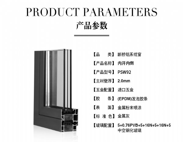 型材采用超高精级挤压标准,特殊受力部位加厚至2.5mm。型材采用54mm尼龙聚酰胺PA66异型隔热条,隔热腔体内采用高密度聚氨酯灌注技术,有效提升型材剪切力,隔声性能,保温隔热性能。