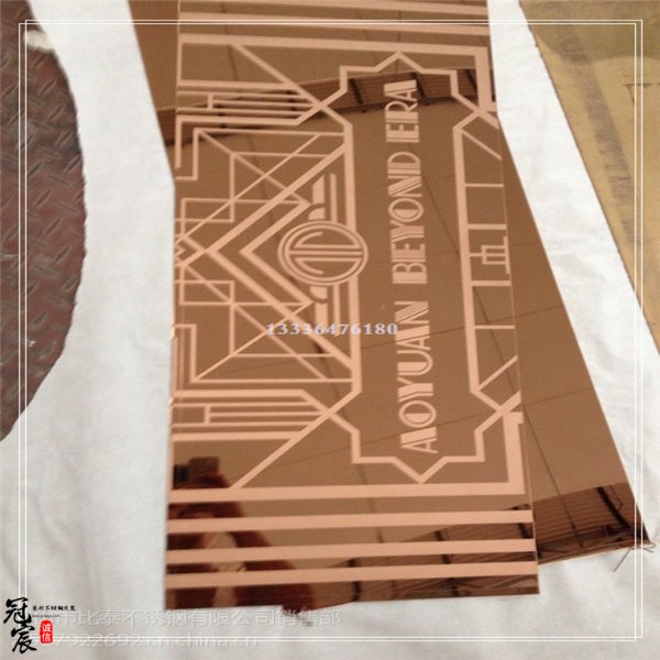 玫瑰金拉丝不锈钢KTV大门是利用304#201#不锈钢板为基材,对其表面进行镜面,拉丝,蚀刻,焊接,抛光等多重工艺处理,使其表面更加的靓丽,多彩。店面装饰是强调了“品牌专卖”的商业店面的个性与独特性,彩色不锈钢钛金色镜面板是充满现代感的装饰材料,常用于展现名牌产品、专利产品、系列产品要有自己独特的店面形象,凸显出自己的商店与众不同。而且彩色不锈钢钛金板表面的金黄色的镜面,简单而光彩照人,能突出店内商品的特性,可以令顾客感受到商品的美感、舒适性,对商品产生一种好感和消费意愿。随着人类对彩色不锈钢金属冶炼技术的掌握和对金属特性的认识,铸造、锻造和焊接等加工工艺的提高,以及现代科技加工如车、剪、折、刨、磨、冲压等工艺的应用,使彩色不锈钢金属装饰艺术的可塑性得以更大的发挥,为这种金属材料的应用提供了多方位的施展空间,令设计师在创作时不受任何限制。彩色不锈钢金属材料开始大量应用于各种环境装饰中,初始是室内小型化的器物雕塑,之后逐渐应用于室外的大型雕塑和环境设施之中,成为环境装饰设计的主要材料之一。佛山冠宸不锈钢镀铜板厂位于中国不锈钢产业名城——佛山,是一家专业从事不锈钢材料、彩色不锈钢、不锈钢装饰板、不锈钢仿古铜板等不锈钢相关产品研究、开发、生产、销售的不锈钢企业。产品款式清新、简洁;工艺精湛、品种、规格齐全。并可根据不同的需求加工定制。