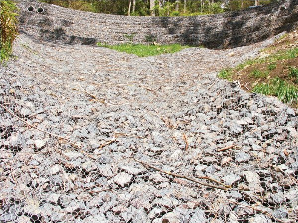 为了减轻湍急的水流冲刷河堤,在河堤的内侧或者河槽的边缘,铺石笼网箱或者石笼网垫,汹涌的河水直接冲击石笼网箱或者石笼网垫,这样保护河堤或者河槽。