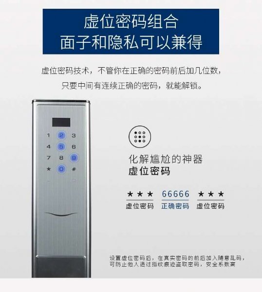 本品有防盗猫眼,一键反锁,报警提示,多种解锁方式,全触摸屏,操作简单,国标级铝合金锁身,超C级锁芯,防技术解锁,德国进口芯片,精工设计,让生活更安心 - 济南陆信智能科技有限公司
