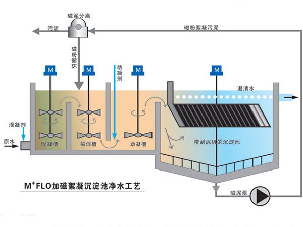 在传统的混合絮凝工艺中,加入经过特殊工艺处理过得磁种,以增强絮凝剂絮凝的效果。在絮凝的过程中形成已磁种为核心的高密度的絮凝体同时加大絮凝体的比重,让包含了各种悬浮物、COD、有机物、磷、重金属等污染物的絮凝体在磁絮凝沉淀池中快速沉降,从而达到除污的目的。