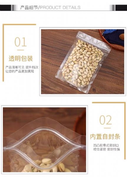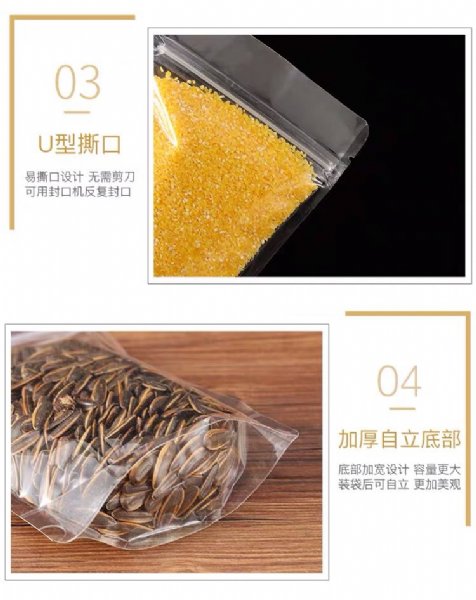 可以重新封闭和重复开启,由于采用拉链形式并不封闭且封闭强度有限,所以种形式不适于封装液体及易挥发物质。根据封边方式不同又分为四封边和三封边两种,四封边是指产品包装在出厂时拉链封口之外还有一层普通封边,使用时需先将普通封边撕开,再利用拉链实现重复封启,这种方法解决了拉链封边强度小不利于运输的缺点。而三封边则是直接用拉链封边作为封口,一般用于盛装轻质产品。带拉链的自立袋一般用于包装一些质轻的固体,如糖果、饼干、果冻等,但四封边的自立袋同样可用于包装大米,猫砂等较重的产品。