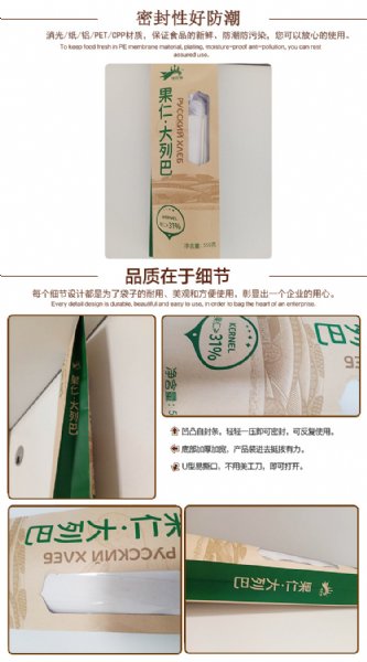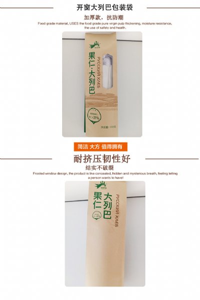 开窗牛皮纸自封袋主要将牛皮纸,PE膜 [4] (用普通设备制作夹链自封袋 [5] ),哑光磨砂膜,通过复合工艺将这几种材料压合在一起,形成美观大方的具有磨砂可视的复合袋 [6] 包装袋。不开窗牛皮纸自封袋主要铝膜,牛皮纸,磨砂PE膜三层复合在一起,形成不可视不开窗口袋。八边封牛皮纸自封袋是通用模具将袋型做成立体包装袋,因牛皮纸立体袋有八条边而得名“牛皮纸八边封袋”。