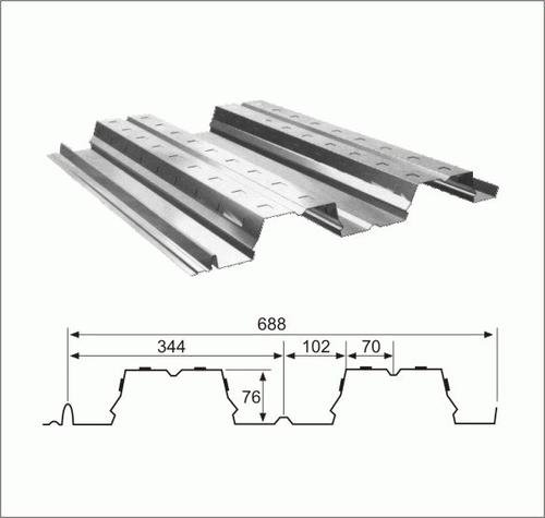 688型楼承板的截面形状是“w”型的,有两个波峰,波高为76mm,波距为344mm,值得一提的是开口楼承板除了使用镀锌钢板压制以外,也可以采用彩色涂镀板压制。
