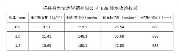 山西688型楼承板的厚度一般有三种:即0.8mm、1.0mm、1.2mm,从每平方米的重量来看,分别是9.13kg/㎡、11.41kg/㎡和13.69kg/㎡;截面惯性矩分别是119.5cm4/m、148.2cm4/m、180.1cm4/m;截面抵抗矩分别是28.54cm3/m、35.68cm3/m、42.83cm3/m;其展开宽度为1000mm,有效使用宽度则为688mm,故称为688型开口楼承板。