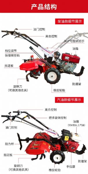 1、 采用直联式传动,特别适用于山区,丘陵,旱地,水田,果园,菜田及大棚作业。
