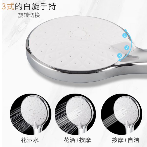 产品特性:把手符合人体工学,手感舒适,不易滑落。特殊配送带过滤网垫圈,为您的花洒增加一道保护屏障,增长花洒的使用寿命,让消费者无后顾之忧