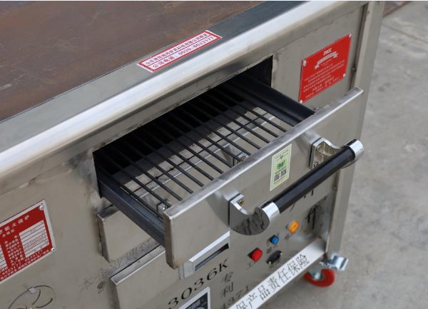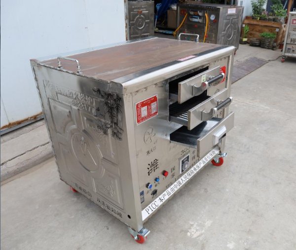 外壳为不锈钢,炉具自动控温,2个高效节能远红外线炉头,电打火、带有熄火保护熄火报警,可烧液化气,也可改为管道天然气;上下两个烤盘,可同时烤制30个火烧,底下有接油盘,炉具带有可移动轮子,两前轮可刹车,上铁板进行包边改进,更实用方便;可以烤潍坊肉火烧,北京烧饼、北京芝麻酥烧饼、泰安火烧,莱芜火烧,济南油旋酥皮火烧,瓤子火烧,河南烧饼,湖北锅魁,烤制包子、烧饼、火烧等等,炉具产品质量由中国人保财险承保,本企业通过ISO9001国际质量体系认证。